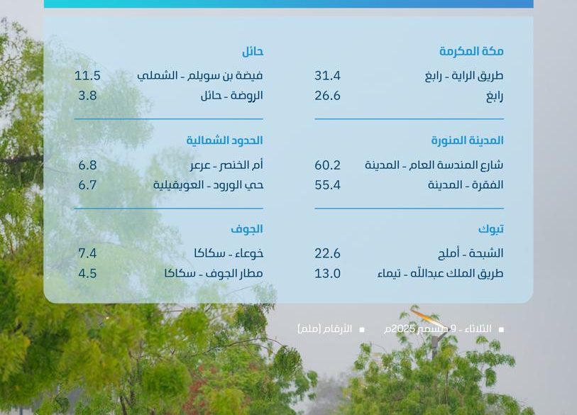 وأوضح التقرير، أن منطقة مكة المكرمة سجّلت 31,4 ملم في طريق الراية برابغ، و26,6 ملم في رابغ، و15,6ملم في غران بخليص، و14,8 ملم في العقلة برابغ. فيما سجّلت منطقة تبوك 22,6 ملم في الشبحة بأملج، و13,0ملم في طريق الملك عبد الله بتيماء، و11,2ملم في العسافية بتيماء. وسجّلت فيضة بن سويلم بالشملي في منطقة حائل 11,5 ملم، والروضة بحائل 3,8 ملم، وكل من حي الورود بالشنان، وبقعاء 1,9 ملم.