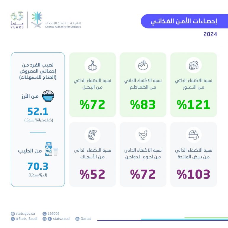 وعلى صعيد آخر, أوضحت نتائج نشرة إحصاءات الأمن الغذائي لعام 2024م، أن نصيب الفرد من إجمالي المتاح للاستهلاك من الأرز بلغ “52.1” كيلوجرامًا سنويًّا، وبلغ نصيب الفرد من التمور “35.8” كيلوجرامًا، ومن البصل “20.5” كيلوجرامًا، ومن الطماطم “19.6” كيلوجرامًا، أما في المنتجات الحيوانية بلغ نصيب الفرد من الحليب “70.3” لترًا سنويًا، ومن الدواجن “46.9” كيلوجرامًا، ومن البيض “235” بيضة سنويًّا.