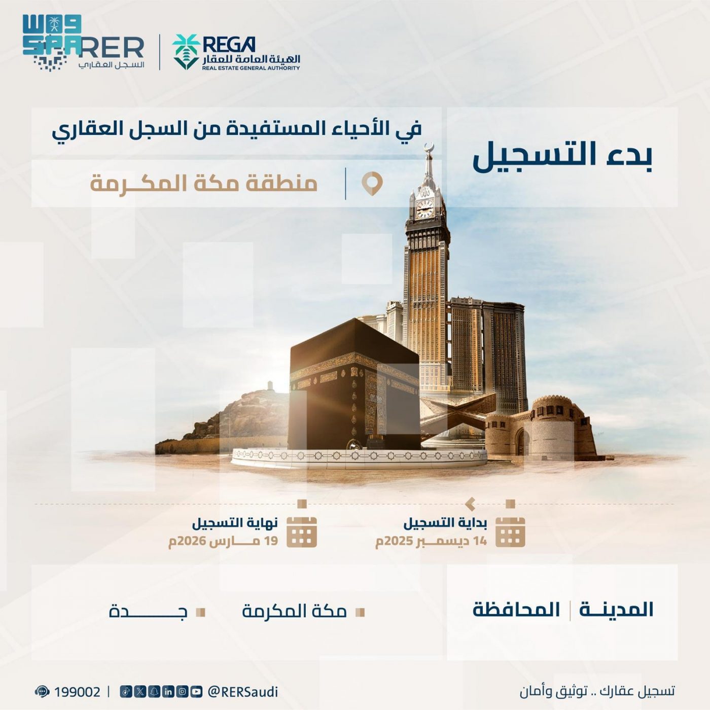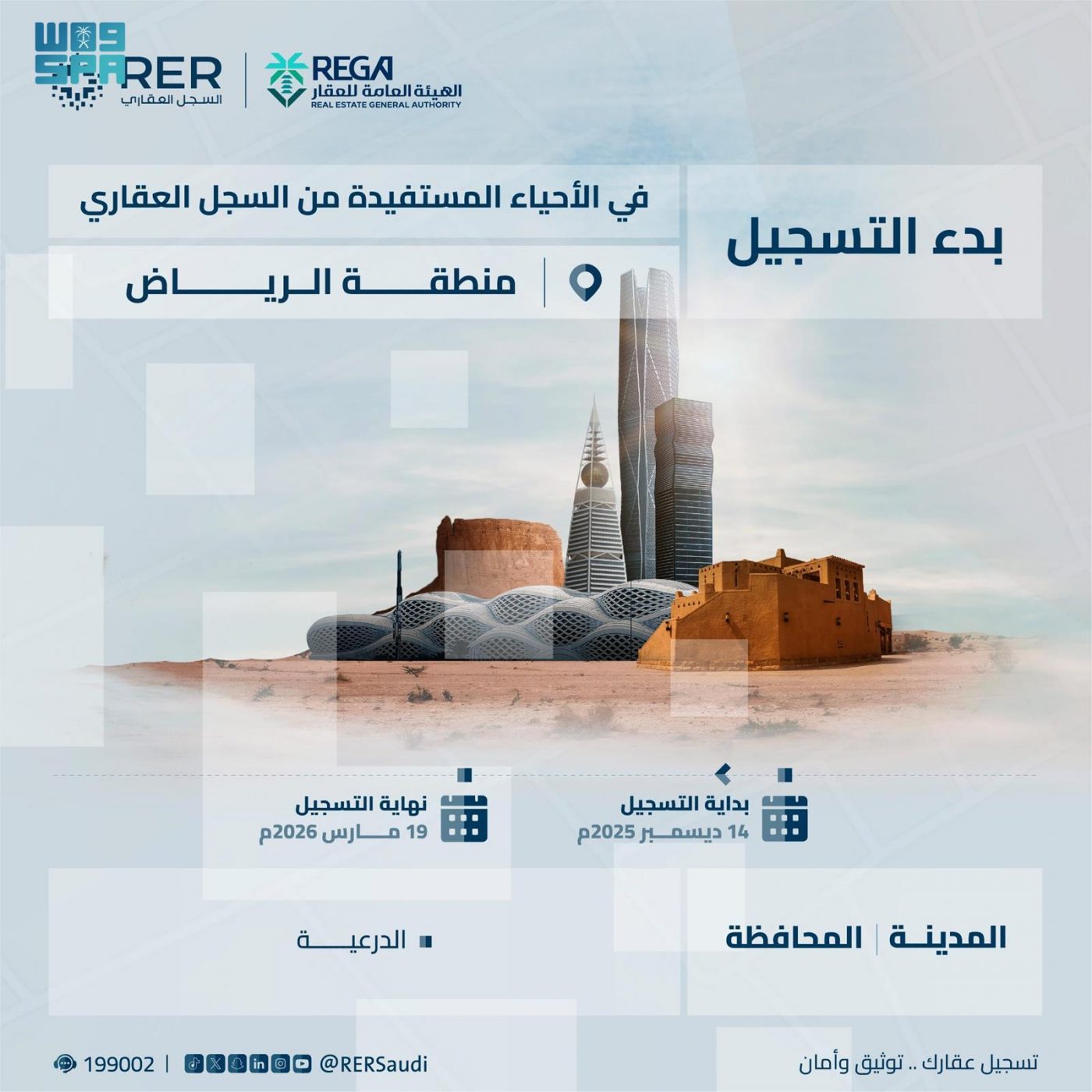 ودعا السجل العقاري ملاك العقارات الواقعة في نطاق الأحياء إلى تسجيل عقاراتهم قبل نهاية يوم 19 مارس 2026م ويمكن التحقق من موقع العقار إذا كان ضمن المناطق المعلنة من خلال منصة السجل العقاري https://rer.sa/، أو تطبيق السجل العقاري، والتواصل مع مركز خدمة العملاء 199002، للاستفسار عن إجراءات وخطوات التسجيل.