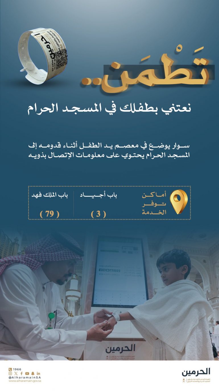 في إطار جهودها المتواصلة لتعزيز مستوى السلامة والعناية بقاصدي بيت الله الحرام، كشفت الهيئة العامة للعناية بشؤون المسجد الحرام والمسجد النبوي عن توفير سوار تعريفي للأطفال، يُوضع في معصم الطفل عند قدومه إلى المسجد الحرام، ويحتوي على بيانات التواصل الخاصة بذويه، بما يسهم في سرعة الوصول إليهم في حال ضياع الطفل أو انفصاله عن مرافقيه.