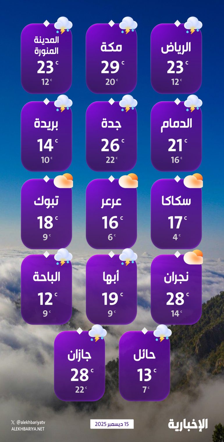 توقّع المركز الوطني للأرصاد في تقريره عن حالة الطقس هذا اليوم -بمشيئة الله- انخفاضًا ملموسًا بدرجات الحرارة بمعظم مناطق المملكة، وهطول أمطار رعدية متوسطة إلى غزيرة، تؤدي إلى جريان السيول، ومصحوبة بزخات من البرد ورياح نشطة مثيرة للأتربة والغبار، على أجزاء من مناطق جازان وعسير والباحة ومكة المكرمة والرياض والقصيم وحائل والشرقية، في حين تكون خفيفة إلى متوسطة على أجزاء من مناطق المدينة المنورة وتبوك والجوف والحدود الشمالية وأجزاء من منطقة نجران، مع فرصة تكون الضباب على أجزاء من تلك المناطق.
