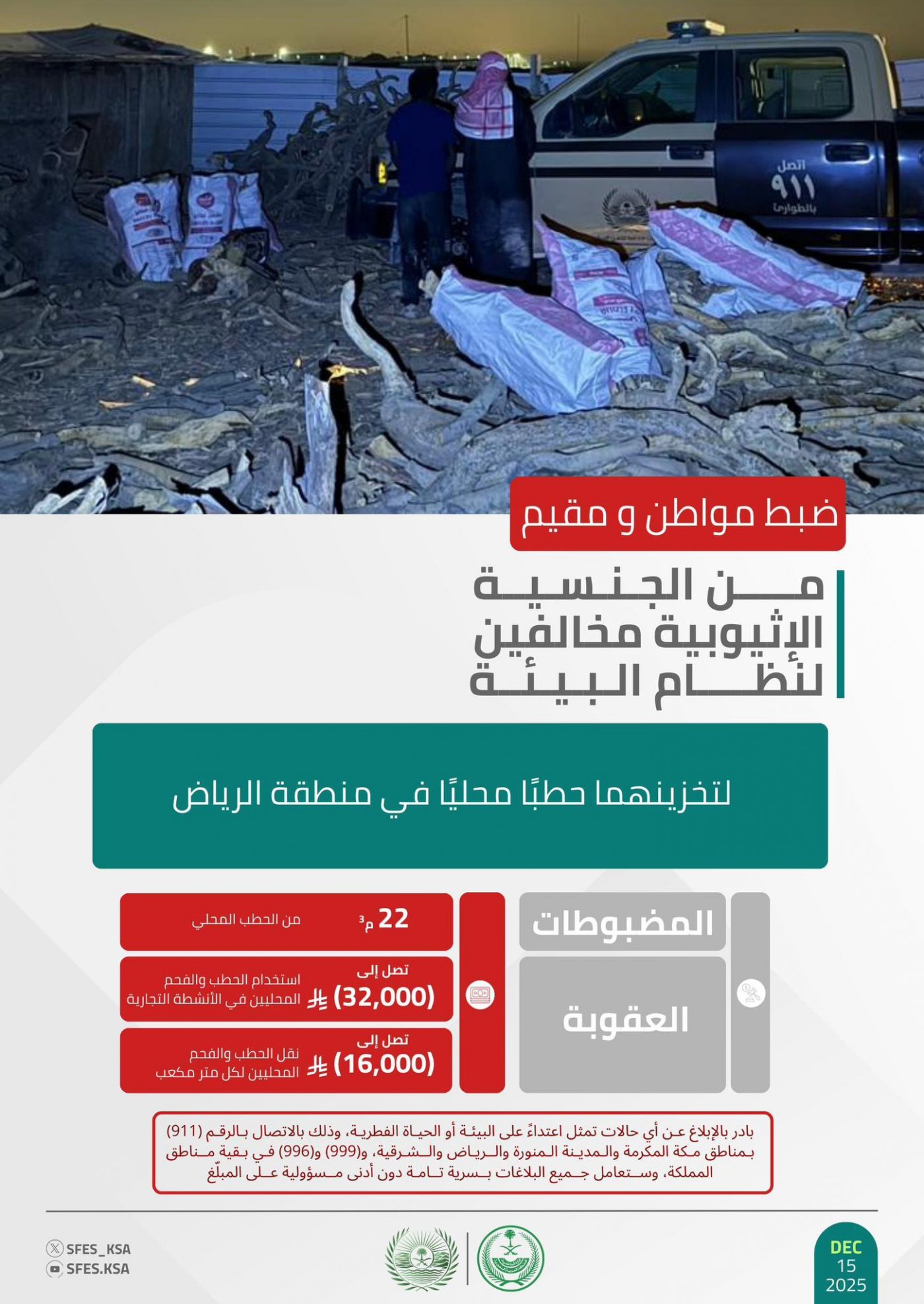 ضبطت القوات الخاصة للأمن البيئي مواطنًا ومقيمًا من الجنسية الإثيوبية مخالفين لنظام البيئة، بحوزتهما (22) مترًا مكعبًا من الحطب المحلي في منطقة الرياض، وطُبقت الإجراءات النظامية بحقهما، وسُلمت الكميات المضبوطة للجهات المختصة. وأوضحت القوات أن عقوبة استخدام الحطب والفحم المحليين في الأنشطة التجارية غرامة تصل إلى (32,000) ريال لكل متر مكعب، وعقوبة نقل وبيع وتخزين الحطب والفحم المحليين غرامة تصل إلى (16,000) ريال لكل متر مكعب.