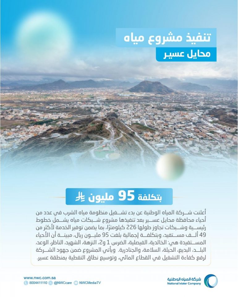 أنهت شركة المياه الوطنية تنفيذ مشروع شبكات المياه في محافظة محايل عسير، وذلك لخدمة عدد من أحياء المحافظة، بتكلفة تبلغ (95) مليون ريال. ويأتي المشروع ضمن جهود الشركة لرفع كفاءة التشغيل في القطاع المائي، وتوسيع نطاق التغطية بمنطقة عسير، وتقديم خدمات مياه موثوقة ومستدامة، تتوافق مع مستهدفات رؤية السعودية 2030 وتحسين جودة الحياة.