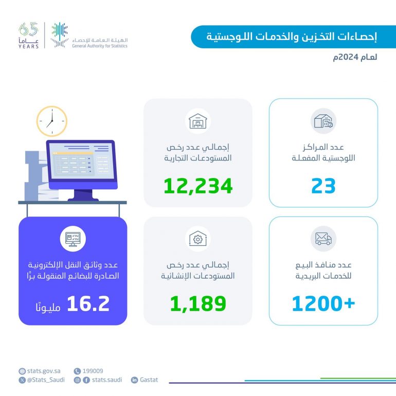يذكر أن إحصاءات التخزين والخدمات اللوجستية تستند إلى السجلات الإدارية لعدد من الجهات الحكومية والخاصة، وهي نشرة سنوية يجري من خلالها توفير إحصاءات ومؤشرات عن قطاع التخزين والخدمات اللوجستية، وتُستخدم هذه النشرة في أغراض المقارنة المحلية والإقليمية والدولية, وإجراء الدراسات والبحوث في مجال التخزين والخدمات اللوجستية.