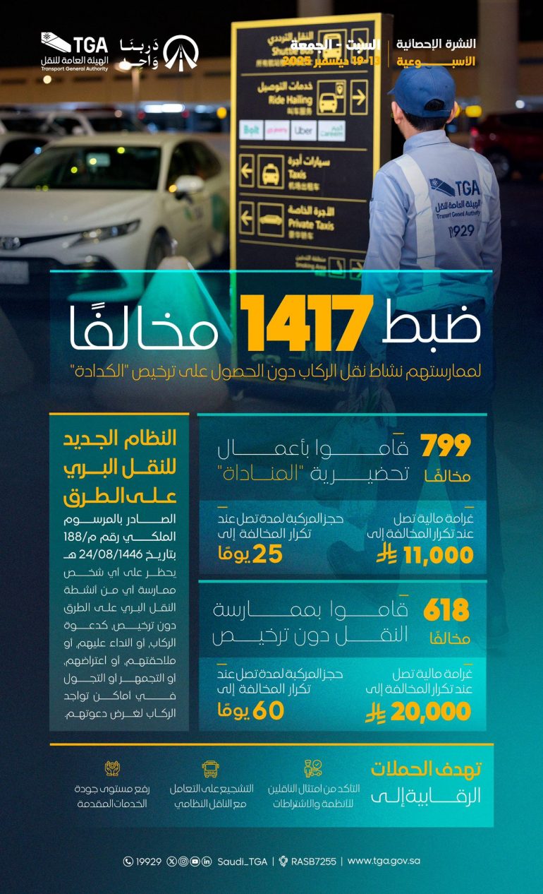 واصلت الفرق الرقابية في الهيئة العامة للنقل جولاتها التفتيشية، إذ ضبطت خلال الفترة من السبت إلى الجمعة الموافق 13 ديسمبر الحالي حتى 19 من شهر ذاته، 1417 مخالفًا، أوقعت بحقهم الإجراءات النظامية التي تتضمن حجز المركبات وغرامات مالية؛ لممارستهم نشاط نقل الركاب دون الحصول على ترخيص “الكدادة”، وذلك في مختلف مناطق المملكة، بالتعاون مع عدد من الجهات المعنية.