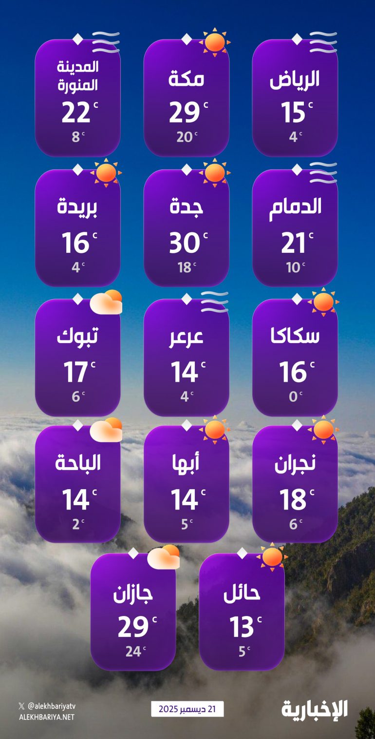 توقّع المركز الوطني للأرصاد في تقريره عن حالة الطقس لهذا اليوم -بمشيئة الله- تدنيًا ملموسًا في درجات الحرارة بمعظم أنحاء المملكة، واستمرار تأثير الرياح النشطة المثيرة للأتربة والغبار على أجزاء من مناطق مكة المكرمة والمدينة المنورة وتبوك خاصة الساحلية منها، في حين لاتزال الفرصة مهيأة لتكون الضباب على أجزاء من مناطق الحدود الشمالية والجوف وحائل والقصيم والرياض والشرقية.
