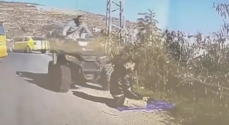 حاول أحد المستوطنين الإرهابيين قتل شاب فلسطيني عبر دهسه بمركبة رباعية بينما كان الشاب يؤدي الصلاة على جانب الطريق دون أن يسبب أي خطورة أو أذي لأحد.