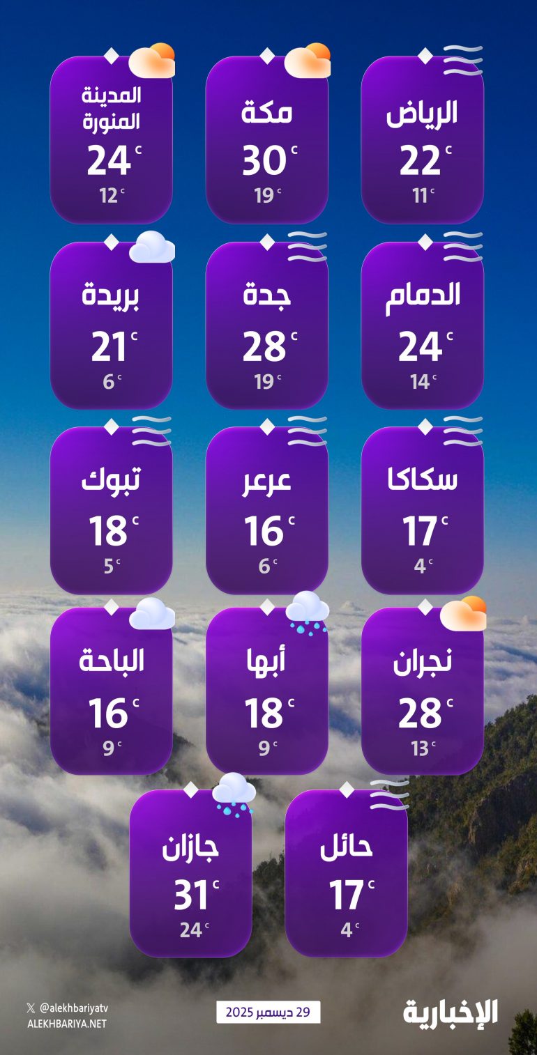 توقّع المركز الوطني للأرصاد في تقريره عن حالة الطقس لهذا اليوم -بمشيئة الله- رياحًا شديدة السرعة، وعواصف ترابية، وانعدامًا في مدى الرؤية الأفقية، مع هطول أمطار خفيفة، على أجزاء من مناطق تبوك والجوف والحدود الشمالية، في حين لاتزال الفرصة مهيأة لتكون الضباب على أجزاء من مناطق المدينة المنورة ومكة المكرمة والباحة وعسير وجازان.