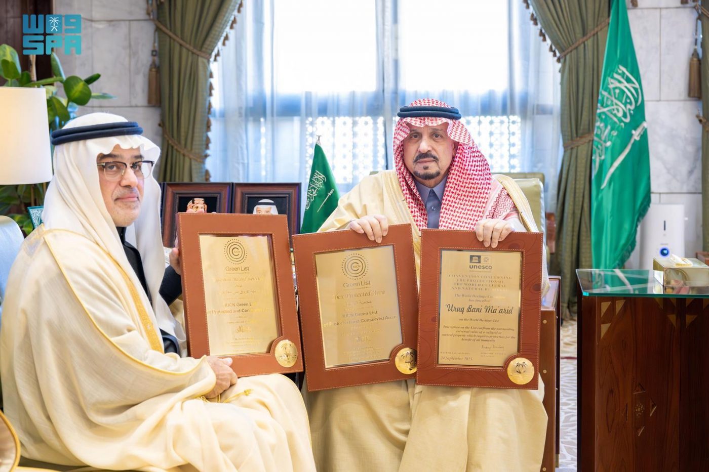 وتسلم سمو الأمير فيصل بن بندر شهادتي إدراج محمية الوعول ومحمية عروق بني معارض ضمن القائمة الخضراء التابعة للاتحاد الدولي لصون الطبيعة، وشهادة تسجيل محمية عروق بني معارض في قائمة اليونسكو للتراث العالمي، بعد استيفائهما المعايير المطلوبة.