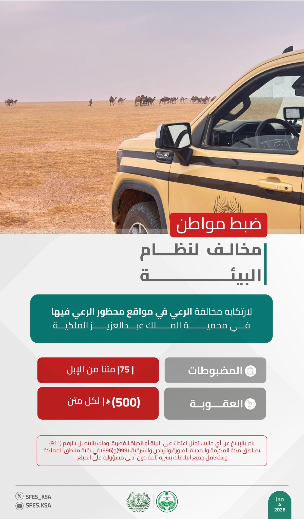 قبضت القوات الخاصة للأمن البيئي على مواطن مخالف لنظام البيئة، لارتكابه مخالفة رعي (75) متنًا من الإبل في مواقع محظور الرعي فيها في محمية الملك عبدالعزيز الملكية، وتم تطبيق الإجراءات النظامية بحقه. وأكدت القوات أن عقوبة رعي الإبل غرامة (500) ريال لكل متن.