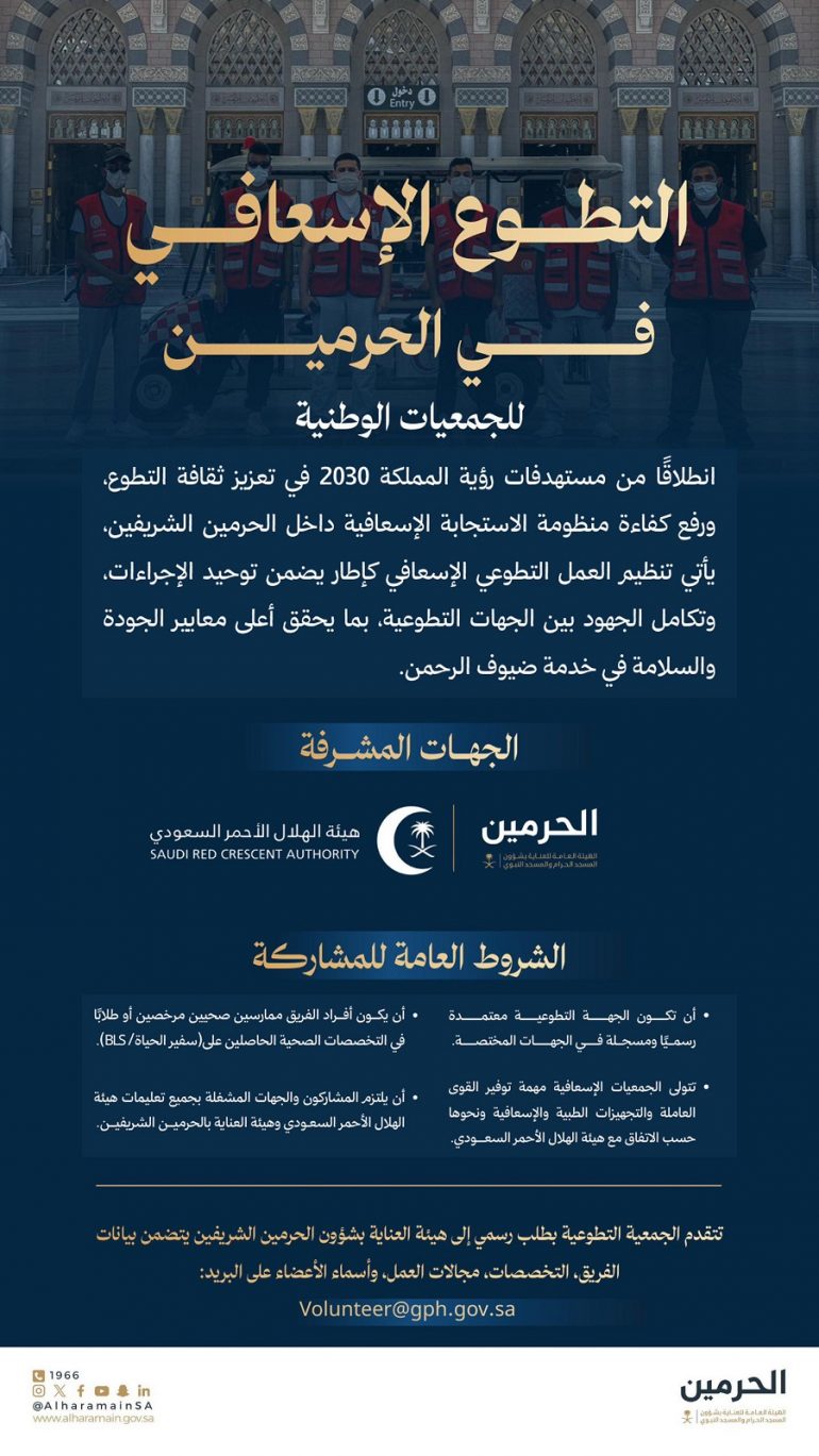 أعلنت الهيئة العامة للعناية بشؤون المسجد الحرام والمسجد النبوي اليوم, إطلاق إطار التطوع الإسعافي للجمعيات الوطنية، وذلك بالشراكة مع هيئة الهلال الأحمر السعودي، في خطوة تهدف إلى تعزيز ثقافة العمل التطوعي، ورفع كفاءة منظومة الاستجابة الإسعافية داخل الحرمين الشريفين، انسجامًا مع مستهدفات رؤية المملكة 2030.