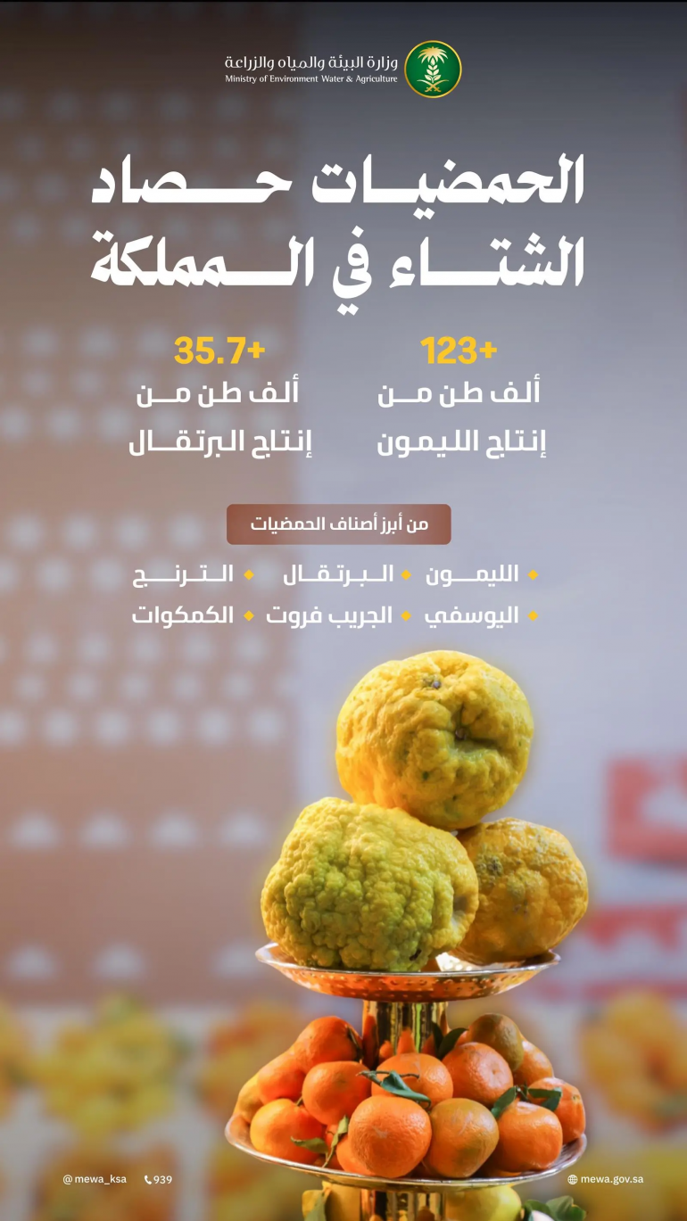 وأوضحت الوزارة، في إطار مستهدفات الحملة التوعوية التي أطلقتها تحت شعار “شتانا صح” في نسختها الثانية، أن إنتاج الحمضيات خلال موسم الشتاء سجّل أكثر من “123” ألف طن من الليمون، إضافةً إلى “35.7” ألف طن من البرتقال، إضافة إلى بقية الأصناف المتنوعة، مثل الترنج، واليوسفي، والجريب فروت، والكمكوات؛ مما يعكس تنوّع الإنتاج الزراعي المحلي وقدرته على تلبية احتياجات السوق.