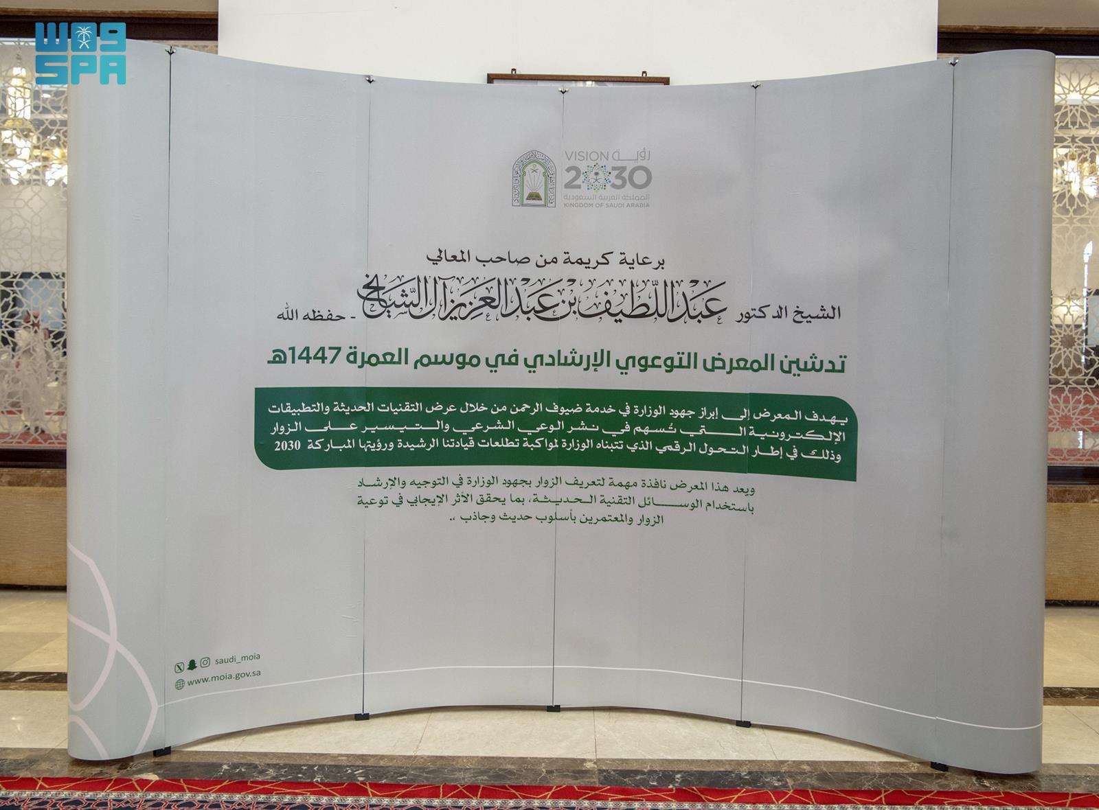 دشّن معالي وزير الشؤون الإسلامية والدعوة والإرشاد الشيخ الدكتور عبداللطيف بن عبدالعزيز آل الشيخ، خلال زيارته التفقدية لقطاعات الوزارة بمنطقة المدينة المنورة، المعرض التوعوي الإرشادي لموسم العمرة 1447هـ، في الساحات المحيطة بالجوامع الكبرى بالمدينة المنورة، شملت مسجد قباء، ومسجد الخندق، ومسجد سيد الشهداء، ومسجد القبلتين، إضافة إلى الميقات.
