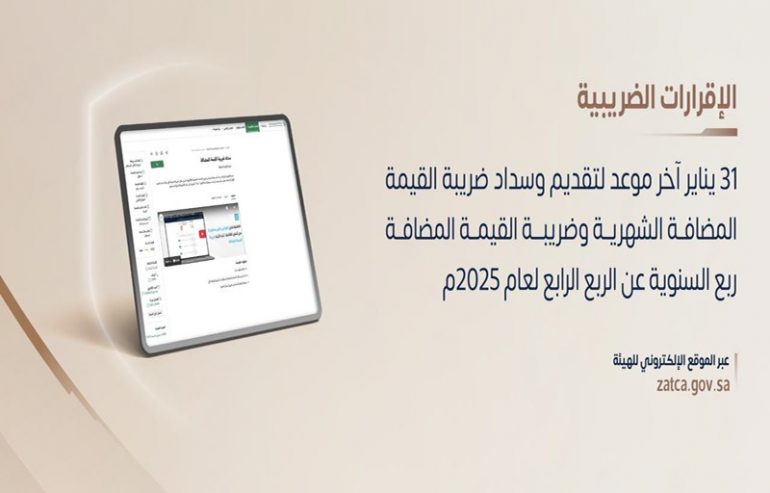 دعت هيئة الزكاة والضريبة والجمارك “زاتكا” المنشآت من قطاع الأعمال الخاضعين لضريبة القيمة المضافة، التي تتجاوز توريداتها السنوية من السلع والخدمات 40 مليون ريال، إلى تقديم إقراراتها الضريبية عن شهر ديسمبر الماضي، فيما دعت المنشآت التي لا تتجاوز توريداتها السنوية 40 مليون ريال إلى تقديم إقراراتها الضريبية عن الربع الرابع من عام 2025م، وذلك في موعدٍ أقصاه 31 من شهر يناير 2026م.