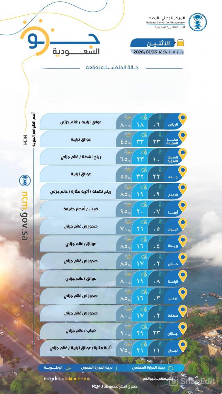 توقّع المركز الوطني للأرصاد في تقريره عن حالة الطقس لهذا اليوم -بمشيئة الله تعالى- رياحًا نشطة مثيرة للأتربة والغبار، تؤدي إلى شبة انعدام في مدى الرؤية الأفقية، على أجزاء من مناطق الرياض والشرقية ونجران، وتمتد إلى الأجزاء الشرقية من المرتفعات الجنوبية الغربية، كذلك على أجزاء من مناطق مكة المكرمة والمدينة المنورة وتبوك، ولا يستبعد هطول أمطار خفيفة، وتكوّن الضباب على أجزاء من منطقتي جازان وعسير.