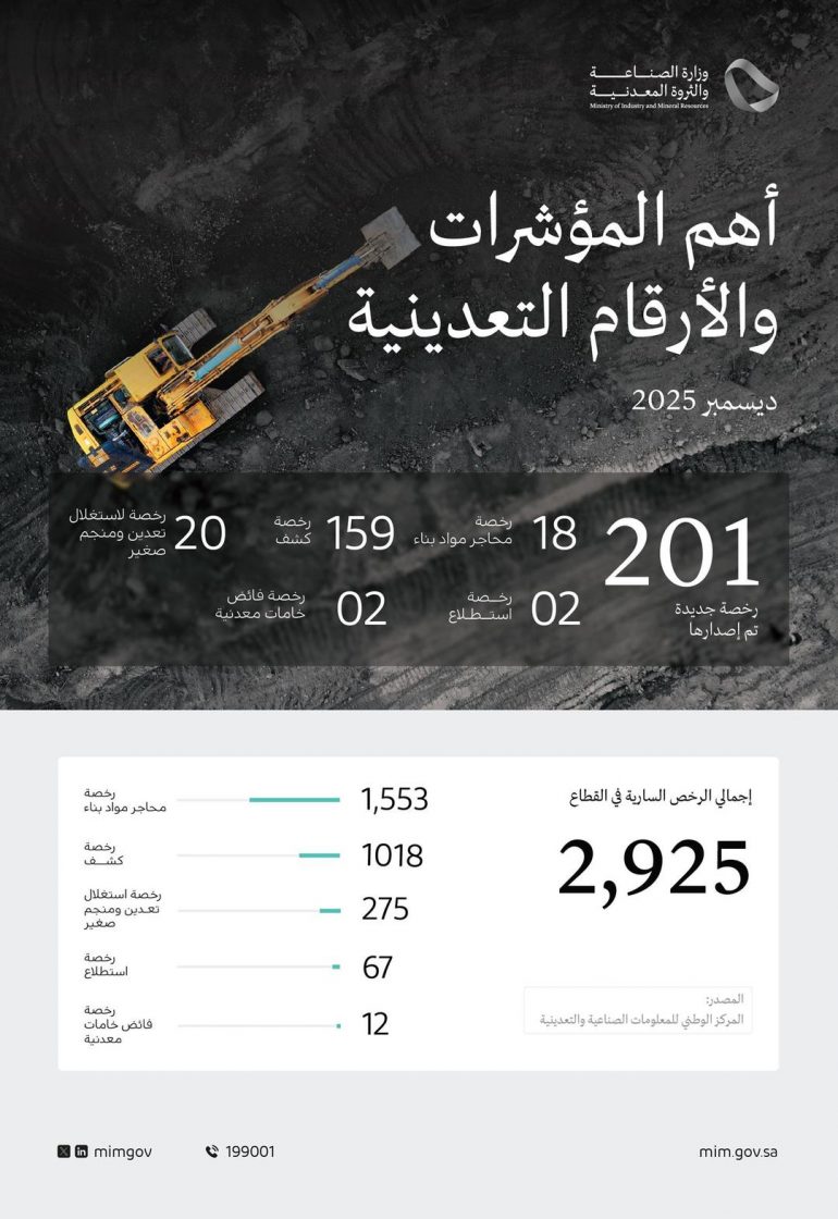 أصدرت وزارة الصناعة والثروة المعدنية 201 رخصة تعدينية جديدة خلال شهر ديسمبر 2025م، في إطار جهودها لتطوير قطاع التعدين بالمملكة وتعظيم الاستفادة منه في تنويع مصادر الدخل للاقتصاد الوطني.