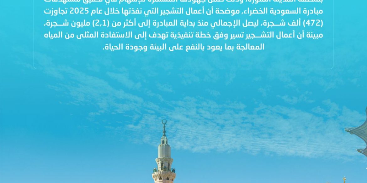 وأوضحت أن أعمال التشجير التي نفذتها بمنطقة المدينة المنورة خلال عام 2025 تجاوزت (472) ألف شجرة، ليصل الإجمالي منذ بداية المبادرة إلى أكثر من (2,1) مليون شجرة، مبينة أن أعمال التشجير تسير وفق خطة تنفيذية تهدف إلى الاستفادة المثلى من المياه المعالجة بما يعود بالنفع على البيئة وجودة الحياة.