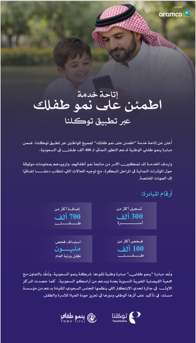 في إطار الجهود الوطنية لتحسين نمو الأطفال، ومتابعته من خلال إجراءات وقائية ذكية، دشّن تطبيق “توكّلنا” خدمة (اطمئن على طفلك) بهدف تزويد الأسر بمعلومات موثوقة عن المؤشرات النمائية في المراحل المبكرة لأطفالهم.