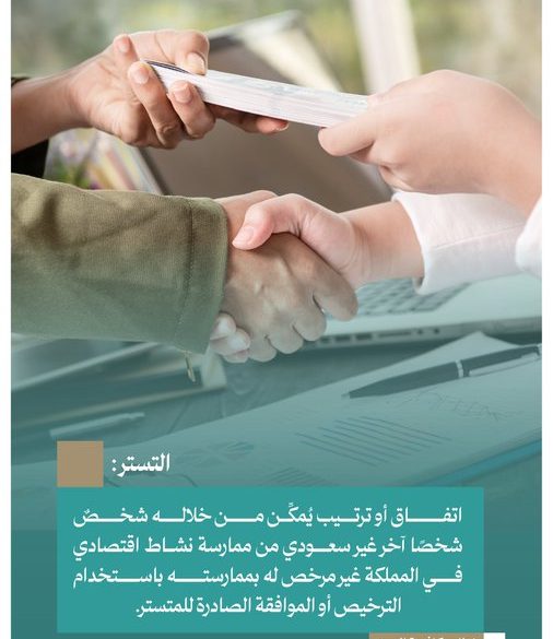 وأوضحت النيابة العامة أن التستر هو اتفاق أو ترتيب يُمكن من خلاله شخصٌ شخصاً أخر غير سعودي من ممارسة نشاط اقتصادي في المملكة غير مرخص له بممارسته باستخدام الترخيص أو الموافقة الصادرة للمتستر.