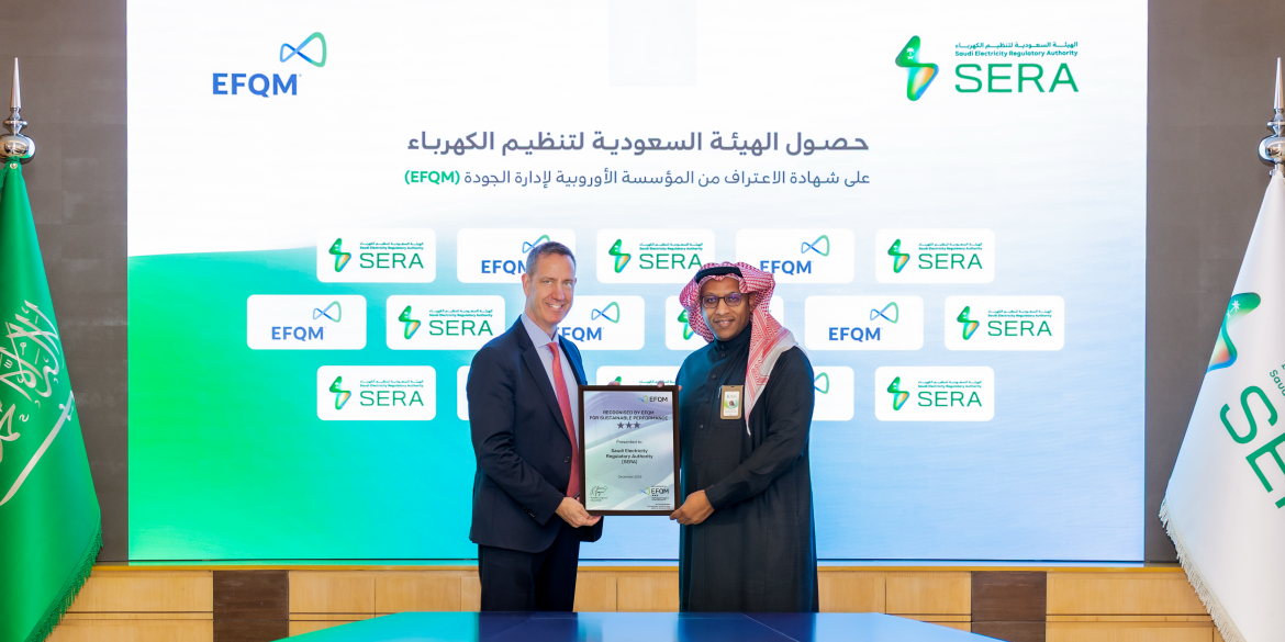 حصلت الهيئة السعودية لتنظيم الكهرباء (SERA) على شهادة الاعتراف من المؤسسة الأوروبية لإدارة الجودة (EFQM) بمستوى ثلاث نجوم، والتي تُعد من أبرز المراجع العالمية في مجال تقييم الجودة والتميّز المؤسسي.