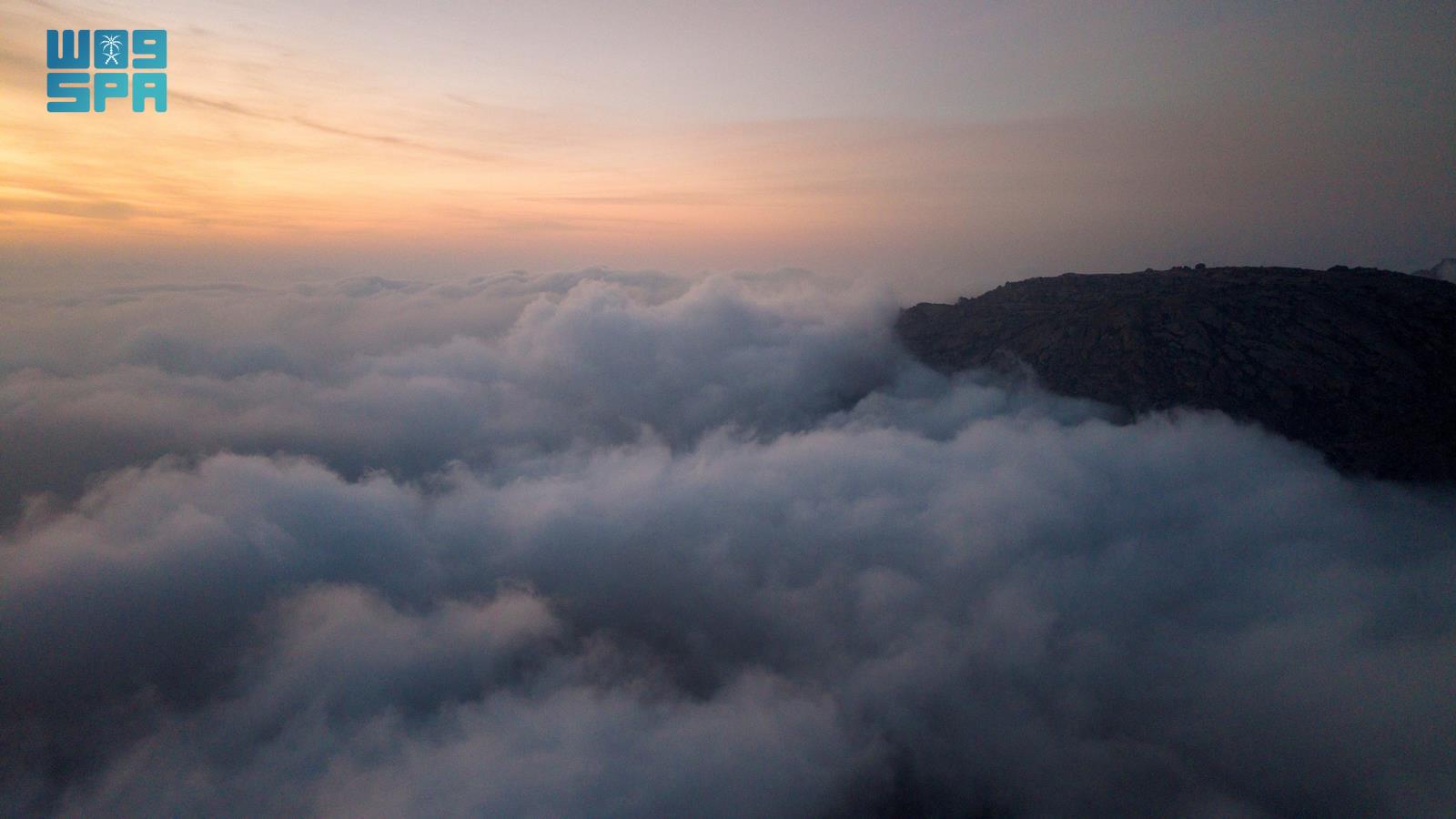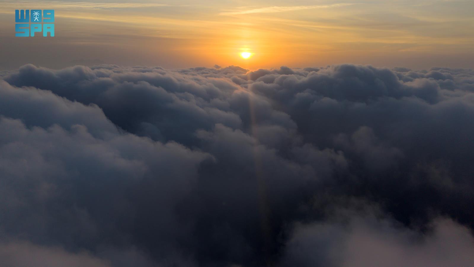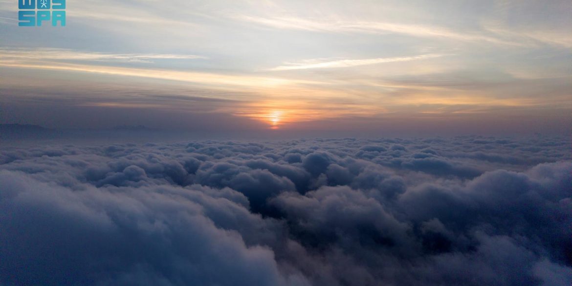 شكّلت السحب المنخفضة الممتدة على السفوح والمرتفعات، وهي تحتضن “جبل شدا الأسفل” غرب محافظة المخواة بمنطقة الباحة، لتخلق لوحة طبيعية شتوية آسِرة تجمع الألوان الدافئة لغروب الشمس وبياض الضباب المتدفق على سفوح الجبال، تضفي على المكان سحرًا خاصًا.