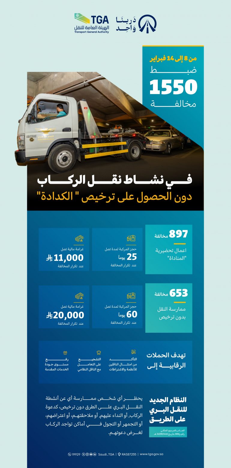 كشفت الهيئة العامة للنقل عن قيام فرقها الرقابية، خلال جولاتها التفتيشية التي نفذتها بالتعاون مع الجهات ذات العلاقة، بضبط أكثر من 1550 مخالفة خلال أسبوع، تتعلق بنشاط نقل الركاب دون الحصول على ترخيص “الكدادة” بمختلف مناطق المملكة، وجرى تطبيق الإجراءات النظامية بحق المخالفين، التي شملت حجز المركبات وإيقاع غرامات مالية وإبعاد غير السعوديين، وفقًا للوائح نظام النقل البري الجديد على الطرق.