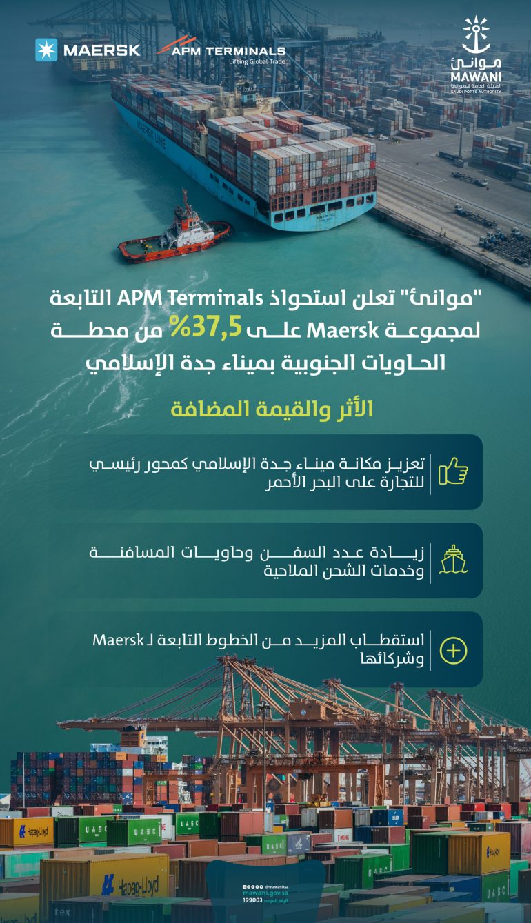 أعلنت الهيئة العامة للموانئ “موانئ” عن استحواذ مجموعة ميرسك العالمية عبر شركة APM Terminals التابعة بالكامل لها على حصة بنسبة 37.5% في محطة الحاويات الجنوبية بميناء جدة الإسلامي، في خطوة تجعل من جدة إحدى أهم بوابات ميرسك لتعزيز الربط بالأسواق المحلية وشبكتها البحرية العالمية.