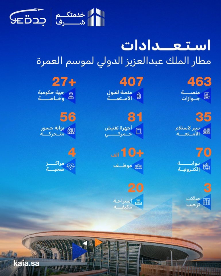 وتضمنت الخطة تشغيل 56 جسرًا متحركًا في صالات المطار لنقل المسافرين مباشرة إلى الطائرات، و35 محطة لسيور الأمتعة، إضافة إلى 81 جهاز تفتيش جمركي، بما يضمن انسيابية الحركة التشغيلية ورفع كفاءة استقبال ومغادرة المعتمرين.