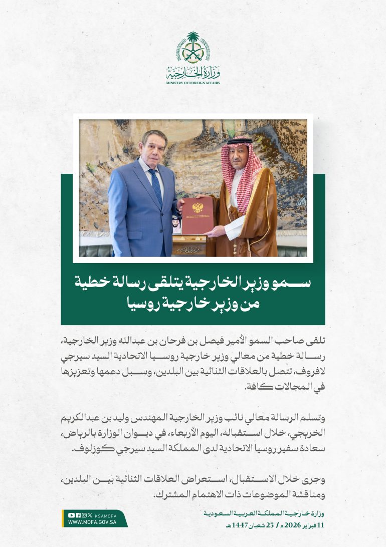 في إطار تبادل الرسائل الخطية بين صاحب السمو الأمير فيصل بن فرحان بن عبدالله وزير الخارجية، ومعالي وزير خارجية روسيا الاتحادية سيرجي لافروف، المتضمنة تهنئة الجانبين بمناسبة الاحتفاء بمرور (100) عام على إقامة العلاقات الدبلوماسية بين البلدين الصديقين، تسلّم -نيابةً عن سمو وزير الخارجية- معالي نائب وزير الخارجية المهندس وليد بن عبدالكريم الخريجي، رسالةً خطيةً، من معالي وزير خارجية روسيا الاتحادية، وذلك خلال استقباله في مقر الوزارة بالرياض اليوم، سفير روسيا الاتحادية لدى المملكة سيرجي كوزلوف.