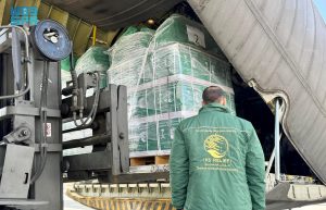 وتحمل الطائرة السعودية الـ”81″ على متنها سلالًا غذائية وحقائب إيوائية تمهيدًا لنقلها إلى المتضررين من الشعب الفلسطيني الشقيق داخل قطاع غزة.