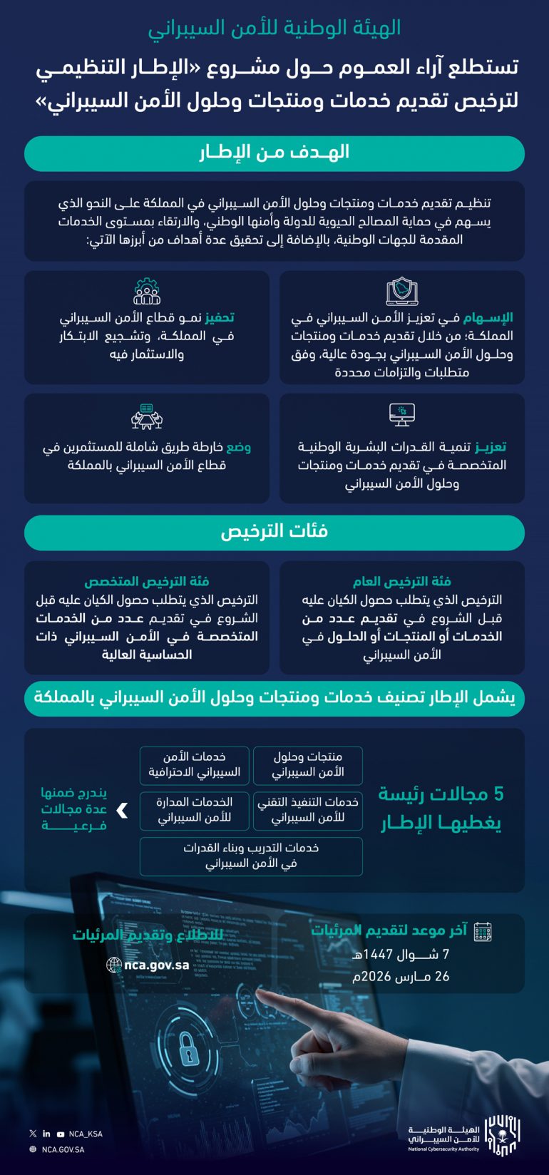 وحثت الهيئة كافة الجهات ذات العلاقة والعموم على إبداء المرئيات حول وثيقة مشروع «الإطار التنظيمي لترخيص تقديم خدمات ومنتجات وحلول الأمن السيبراني»، وحددت يوم الخميس 7 شوال 1447هـ الموافق 26 مارس 2026م آخر موعد لتلقي المرئيات، وذلك من خلال المنصة الإلكترونية الموحدة لاستطلاع آراء العموم “استطلاع”، أو من خلال تعبئة نموذج تقديم المرئيات المتاح في الموقع الإلكتروني للهيئة وإرساله إلى: info@nca.gov.sa. كما يمكن الحصول على نسخة من الوثيقة وتقديم المرئيات بشأنها من خلال الموقع الإلكتروني للهيئة.