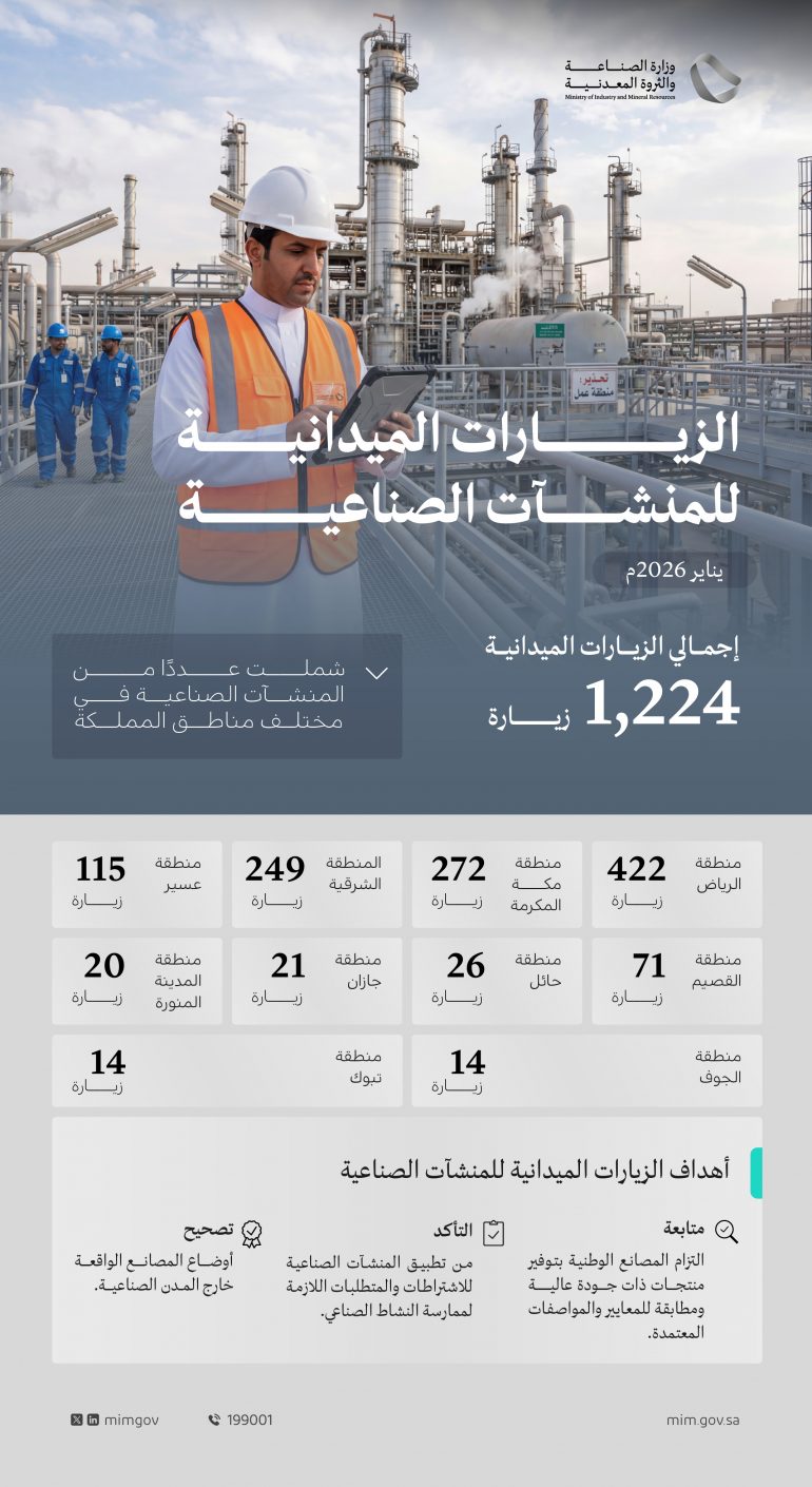 وأوضح المتحدث الرسمي لوزارة الصناعة والثروة المعدنية، جرّاح بن محمد الجرّاح، أنَّ الزيارات الميدانية المُنفَّذة خلال شهر يناير 2026 شملت 422 زيارة للمصانع في منطقة الرياض، و272 زيارة في منطقة مكة المكرمة، و249 زيارة في المنطقة الشرقية، إضافةً إلى 115 زيارة في منطقة عسير، و71 زيارة في منطقة القصيم، و26 زيارة في منطقة حائل، و21 زيارة في منطقة جازان، و20 زيارة في منطقة المدينة المنورة، و14 زيارة في كلٍ من منطقة الجوف ومنطقة تبوك.