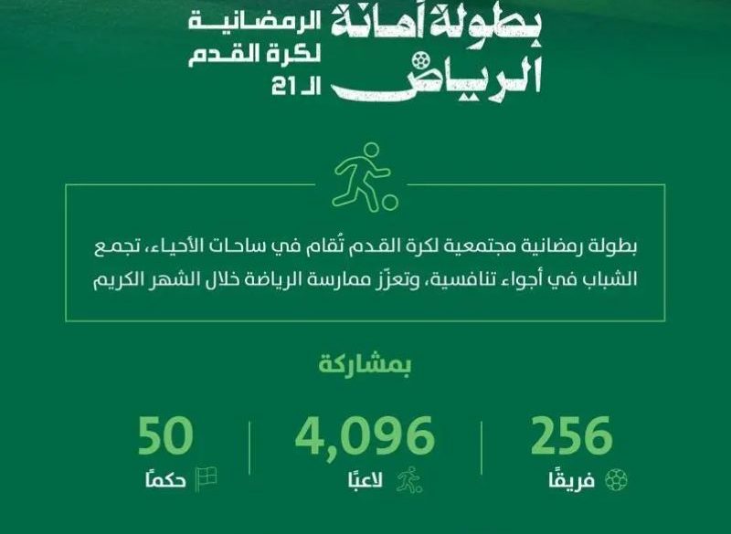بدأ 256 فريقًا وأكثر من 4 آلاف لاعب التنافس في بطولة كأس أمانة منطقة الرياض الرمضانية في نسختها الـ21، التي تُقام في 17 ساحة رياضية بمدينة الرياض، بمشاركة 50 حكمًا و32 مشرفًا، في أجواء تنافسية تعزز حضور الرياضة في الأحياء خلال الشهر الكريم، وتستقطب شريحة واسعة من الشباب في مختلف مناطق العاصمة.