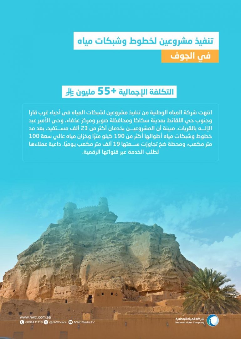 وبيّنت الشركة أن المشروعين تضمنا تنفيذ شبكات المياه في أحياء غرب قارا وجنوب حي اللقائط بمدينة سكاكا، ومحافظة صوير، ومركز عذفاء، وحي الأمير عبد الإله بالقريات، وذلك بعد مد خطوط وشبكات مياه أطوالها أكثر من (190) كيلومترًا، وخزان مياه عال بسعة (100) متر مكعب، ومحطة ضخ تجاوزت سعتها (19) ألف متر مكعب يوميًا.