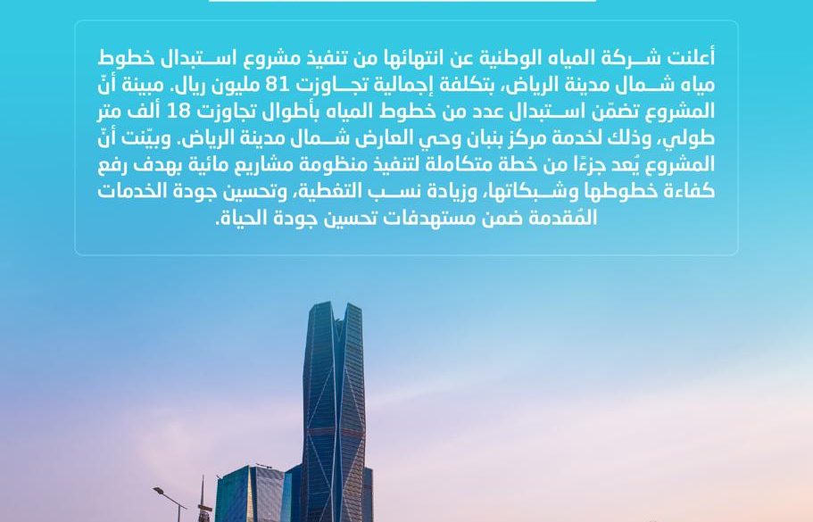 أعلنت شركة المياه الوطنية عن انتهائها من تنفيذ مشروع استبدال خطوط مياه شمال مدينة الرياض، بتكلفة إجمالية تجاوزت (81) مليون ريال. مبينة أنّ المشروع تضمّن استبدال عدد من خطوط المياه بأطوال تجاوزت (18) ألف متر طولي، وذلك لخدمة مركز بنبان وحي العارض شمال مدينة الرياض.