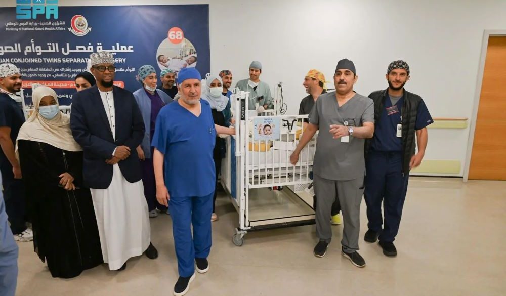 تمكّن الفريق الطبي والجراحي السعودي في البرنامج السعودي للتوائم الملتصقة اليوم -بحمدالله- من فصل التوأم الملتصق الصومالي “رحمة ورملا”، وذلك بمستشفى الملك عبدالله التخصصي للأطفال بمدينة الملك عبدالعزيز الطبية للحرس الوطني في مدينة الرياض، بعد عملية جراحية معقدة استغرقت (12) ساعة نفذت على (8) مراحل، وشارك فيها (36) من الاستشاريين والمختصين والفنيين في أقسام التخدير، وجراحة الأطفال، وجراحة المسالك البولية، وجراحة العظام، وجراحة التجميل، إضافة إلى الكوادر التمريضية والفنية.