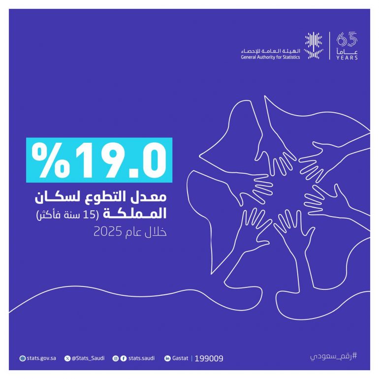 أصدرت الهيئة العامة للإحصاء نتائج إحصاءات العمل التطوعي لعام 2025م، والتي أظهرت أن معدل التطوع للسكان من عمر 15 سنة فأكثر بلغ 9.5% خلال 4 أسابيع، و19.0% خلال 12 شهرًا، وشهد الذكور معدلات تطوع أعلى من الإناث في الفترتين، إذ بلغ معدل تطوع الذكور خلال 4 أسابيع 11.1% مقابل 6.3% للإناث، كما بلغ معدل تطوع الذكور خلال 12 شهرًا 21.5% مقابل 14.2% للإناث.
