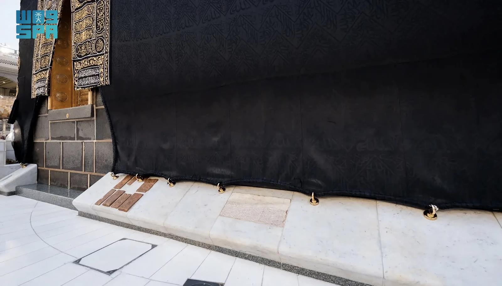 ويتكون الشاذروان من رخام مصقول ثُبّت بعناية، وتوجد فيه حلقات تُربط بها كسوة الكعبة المشرفة لتثبيتها، مما يعكس دقة العناية بالتفاصيل المعمارية المرتبطة بالبيت الحرام.