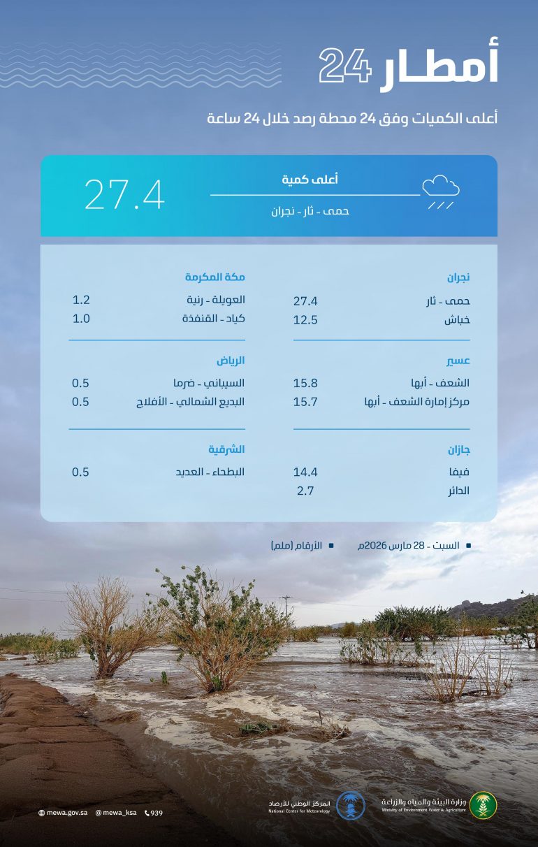 ووفقًا للتقرير اليومي لوزارة البيئة والمياه والزراعة حول رصد كميات هطول الأمطار في مناطق المملكة كافة؛ رصدت 24 محطة رصد هيدرولوجي ومناخي، خلال الأربع وعشرين ساعة الماضية، هطول أمطارٍ في مناطق (الرياض، مكة المكرمة، الشرقية، عسير، جازان، ونجران).