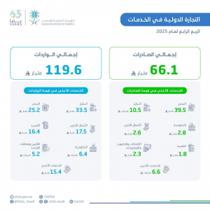 وفي السياق، أوضحت الهيئة العامة للإحصاء بلوغ قيمة صادرات الخدمات من المملكة العربية السعودية للربع الرابع من عام 2025م (66,1) مليار ريال سعودي، فيما بلغت قيمة واردات الخدمات إلى المملكة العربية السعودية للربع الرابع من عام 2025م (119,6) مليار ريال سعودي.
