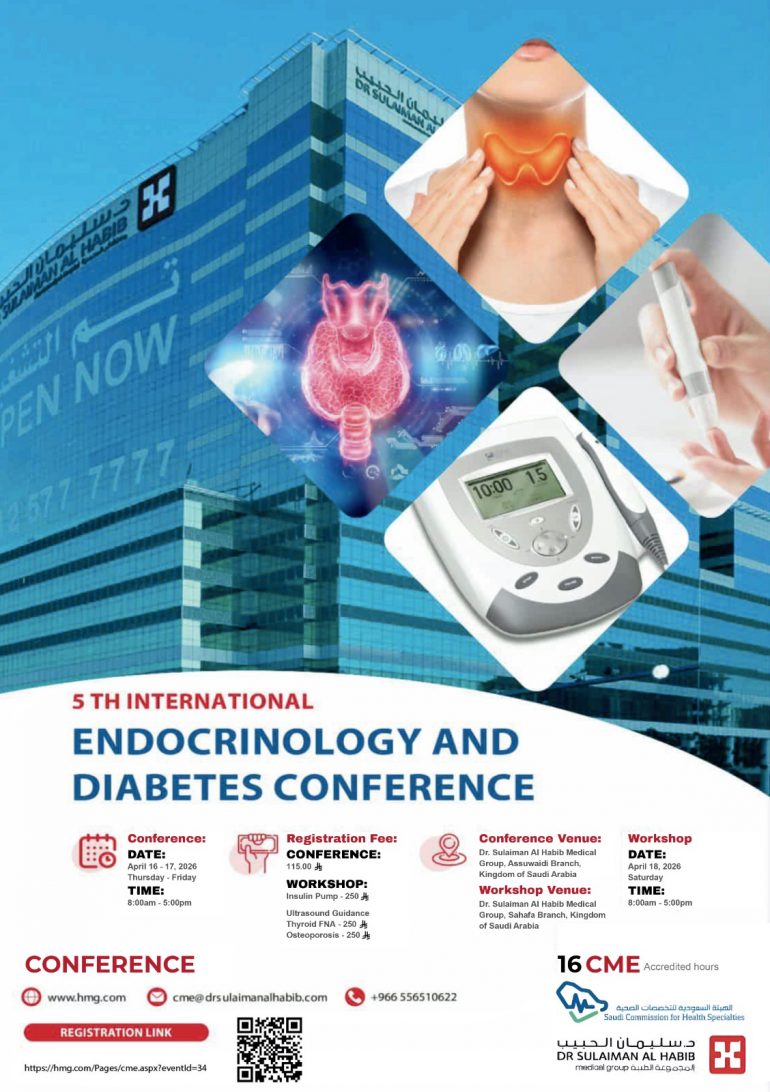 تُنظّم مجموعة الدكتور سليمان الحبيب الطبية المؤتمر الدولي الخامس للسكري والغدد الصماء خلال الفترة من 28 شوال إلى الأول من ذي القعدة 1447هـ، الموافق 16-18 إبريل 2026م، بمستشفى الدكتور سليمان الحبيب بالسويدي، المعتمد من هيئة التخصصات الصحية بواقع 16 ساعة تعليم طبي مستمر، وذلك بمشاركة نخبة من الاستشاريين والمتخصصين والمهتمين من خارج وداخل المملكة في مجال السكري والغدد الصماء وهشاشة العظام، لمناقشة أحدث المستجدات العلمية والتقنيات العلاجية الحديثة التي تستهدف تطوير الممارسات الطبية وتعزيز جودة الرعاية الصحية.
