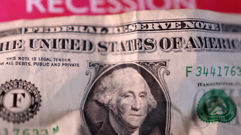 U.S. dollar banknote and a label with the word "Recession" are seen in this illustration taken March 19, 2025. REUTERS/Dado Ruvic/Illustration