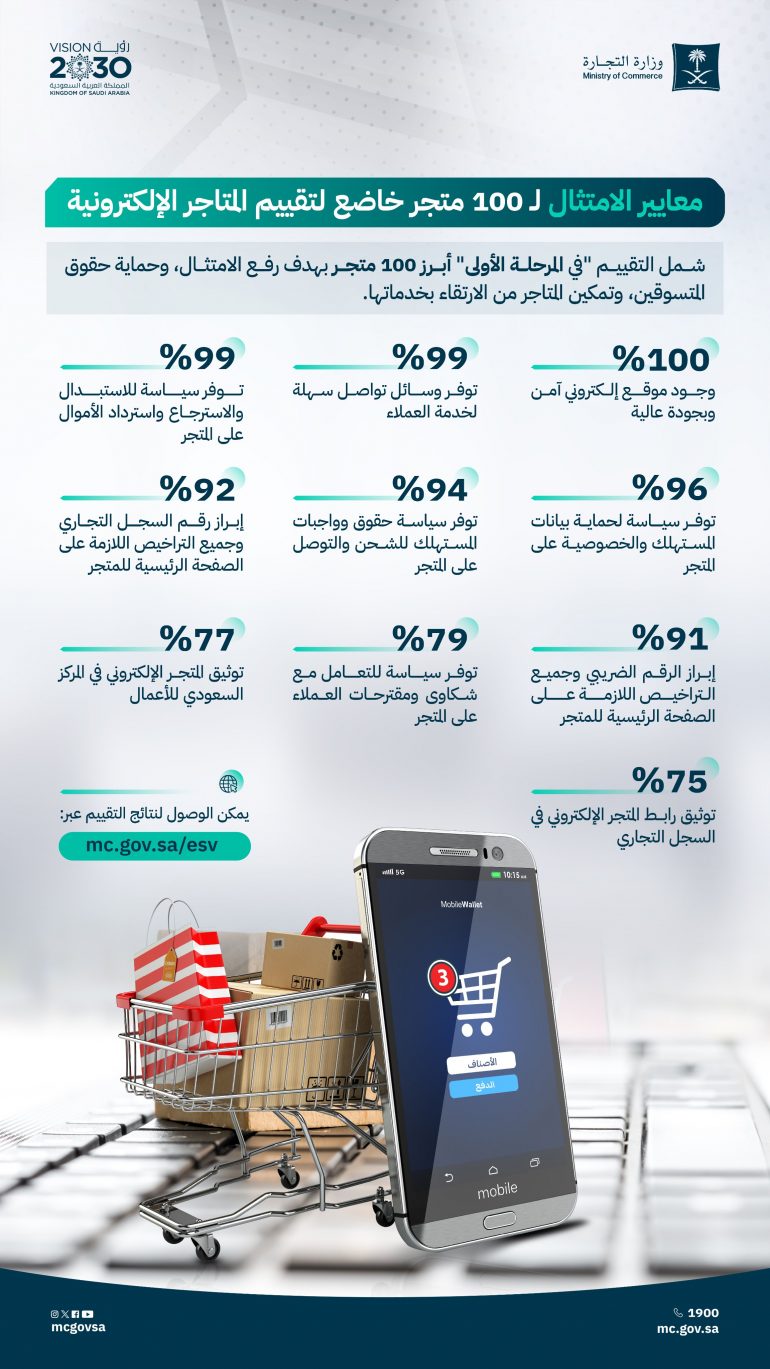 وبينت الوزارة أن المتاجر الخاضعة للتقييم سجَّلت امتثالاً بنسبة 100% في معيار وجود موقع إلكتروني آمن وبجودة عالية الذي يقيس العناصر التالية: (سرعة الموقع، وسهولة الاستخدام، وتوفر حماية الأمن السيبراني). وسجلت المتاجر امتثالًا بنسبة 99% في معيار توفر وسائل تواصل سهلة لخدمة العملاء لتمكين المتسوق من التواصل المباشر، ونسبة 99% في معيار توفر سياسة للاستبدال والاسترجاع واسترداد الأموال على المتجر.
