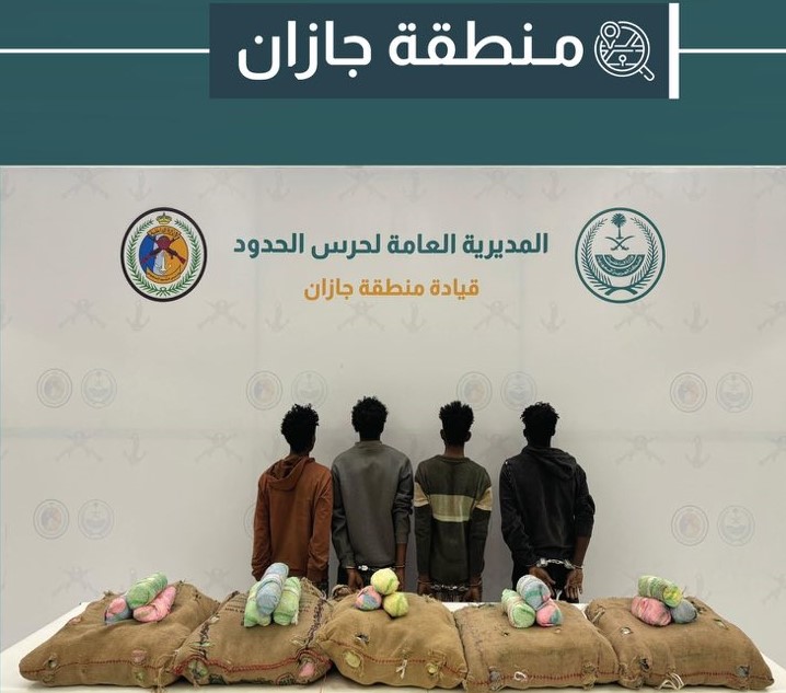قبضت الدوريات البرية لحرس الحدود في قطاع الدائر بمنطقة جازان على (4) مخالفين لنظام أمن الحدود من الجنسية الإثيوبية، لتهريبهم (90) كيلوجرامًا من نبات القات المخدر، واستكملت الإجراءات النظامية الأولية بحقهم، وسُلّموا والمضبوطات لجهة الاختصاص.