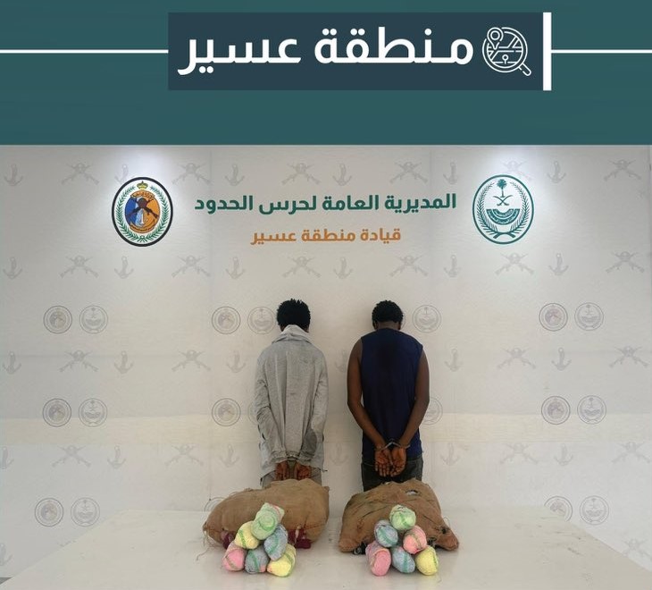 كما قبضت الدوريات البرية لحرس الحدود في قطاع الربوعة بمنطقة عسير على مخالفين لنظام أمن الحدود من الجنسية الإثيوبية، لتهريبهما (40) كيلوجرامًا من نبات القات المخدر، واستكملت الإجراءات النظامية الأولية بحقهما، وسُلّما والمضبوطات لجهة الاختصاص.