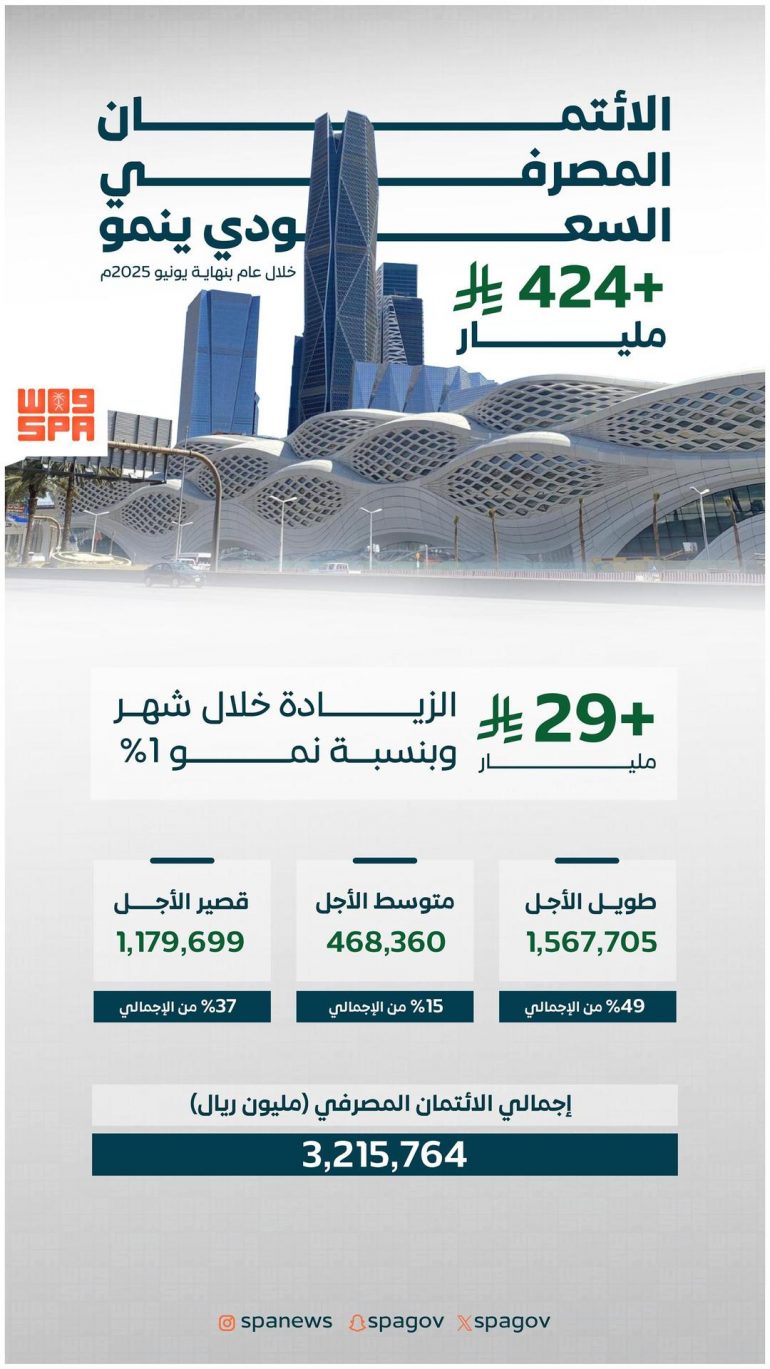 وأوضحت النشرة الإحصائية الشهرية الصادرة عن البنك المركزي السعودي لشهر يوليو 2025م، أن إجمالي الائتمان المصرفي حقق كذلك نموًّا شهريًّا بنسبة تقارب (1%) بزيادة بلغت (29,493) مليون ريال مقارنةً بشهر يونيو الماضي، الذي بلغ فيه الائتمان المصرفي (3,186,271) مليون ريال.