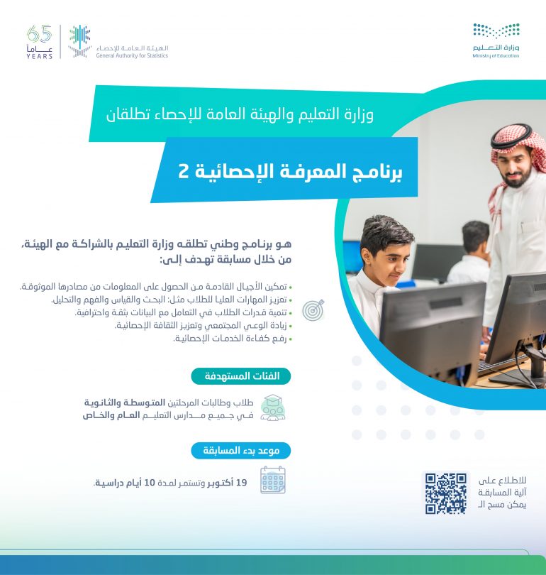ويأتي البرنامج في إطار الشراكة الاستراتيجية بين الهيئة ووزارة التعليم لرفع مستوى الثقافة الإحصائية بين طلاب وطالبات المرحلتين المتوسطة والثانوية، وتدريبهم على التطبيق العملي لمفاهيم الإحصاء الأساسية في حياتهم اليومية، وتنمية مهارات التفكير النقدي والتحليل الكمي لديهم؛ مما يعزز جاهزيتهم للمراحل التعليمية المتقدمة ودراسة التخصصات العلمية المستقبلية التي يتطلبها سوق العمل.
