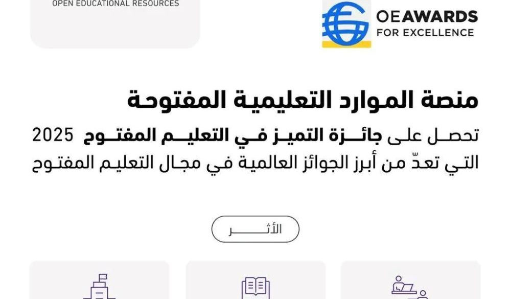 حققت المنصة الوطنية للموارد التعليمية المفتوحة (OERx) التابعة للمركز الوطني للتعليم الإلكتروني جائزة التميّز في التعليم المفتوح لعام (2025) من منظمة التعليم المفتوح العالمية (Open Education Global)، وذلك ضمن فئة الابتكار في الموارد التعليمية المفتوحة، التي تُعد من أبرز الجوائز الدولية الداعمة لجهود نشر المعرفة وتمكين التعليم المفتوح.