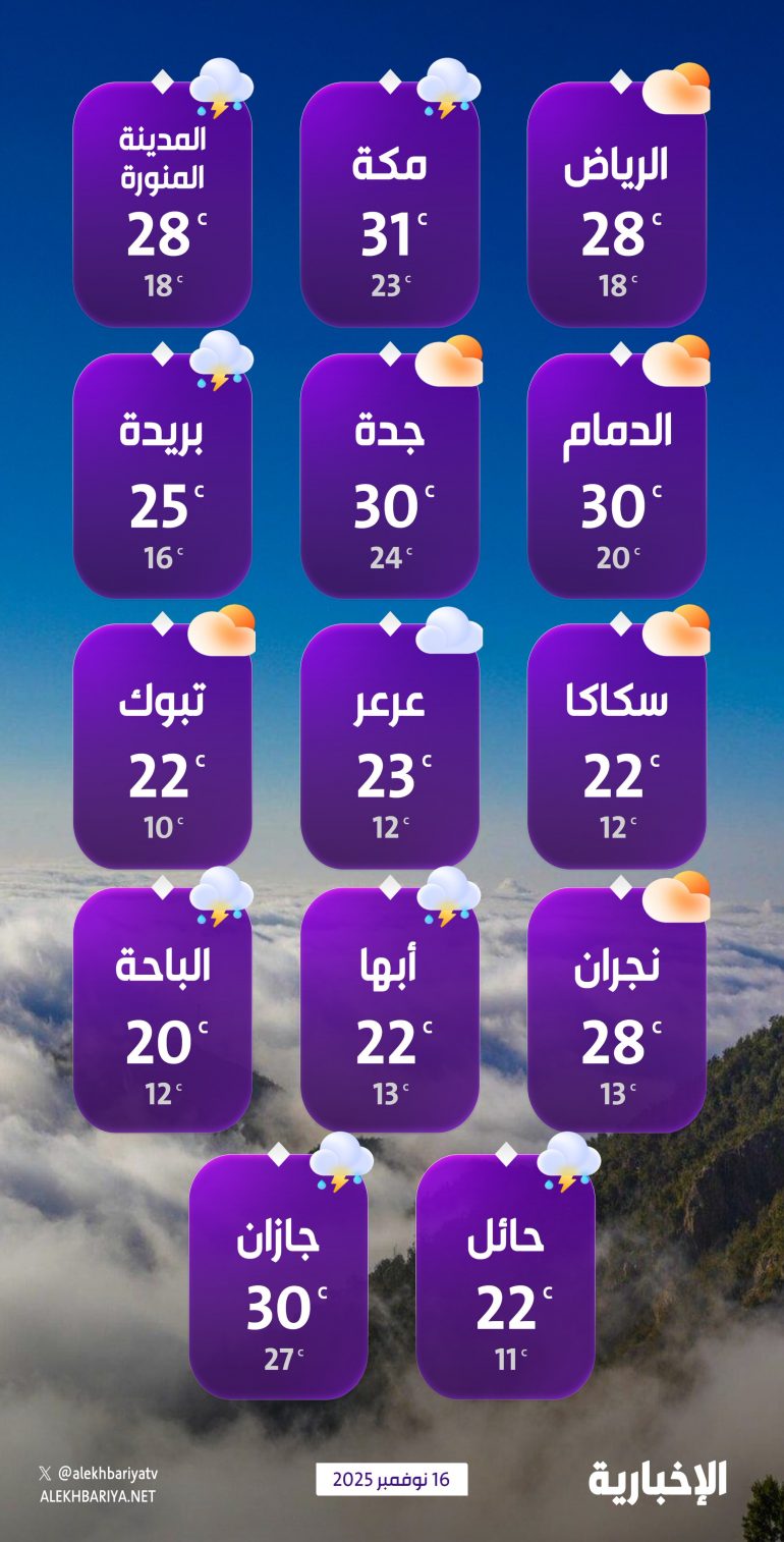 توقّع المركز الوطني للأرصاد في تقريره عن حالة الطقس هذا اليوم -بمشيئة الله تعالى- هطول أمطار رعدية متوسطة إلى غزيرة، تؤدي إلى جريان السيول، مصحوبة بزخات من البرد ورياح نشطة مثيرة للأتربة والغبار، على مناطق جازان وعسير والباحة ومكة المكرمة والمدينة المنورة والقصيم وحائل والشرقية، كما تكون خفيفة إلى متوسطة على مناطق الجوف والحدود الشمالية والرياض، في حين لا يستبعد تكوّن الضباب على تلك المناطق.