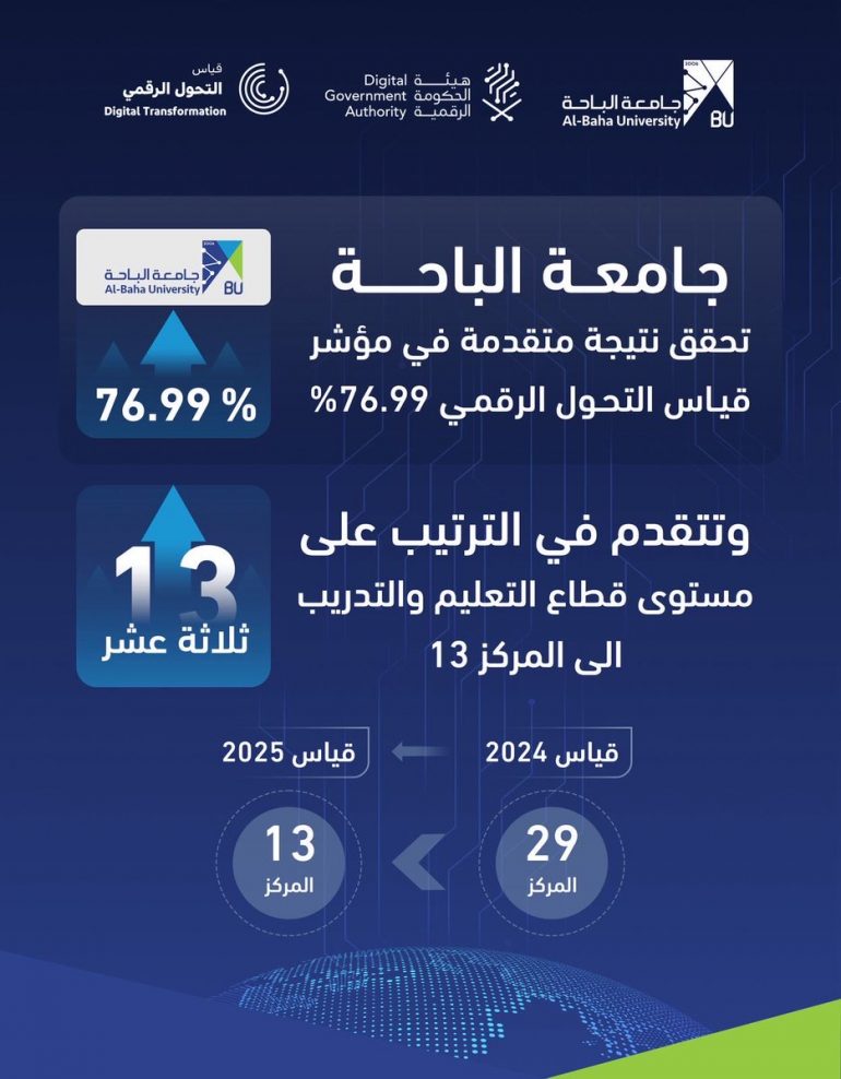 حققت جامعة الباحة المركز الثالث عشر في مؤشر قياس التحول الرقمي لعام 2025، على مستوى قطاع التعليم والتدريب في المملكة، وفقًا للنتائج المعلنة خلال ملتقى الحكومة الرقمية، محققة نسبة متقدمة 76.99٪.